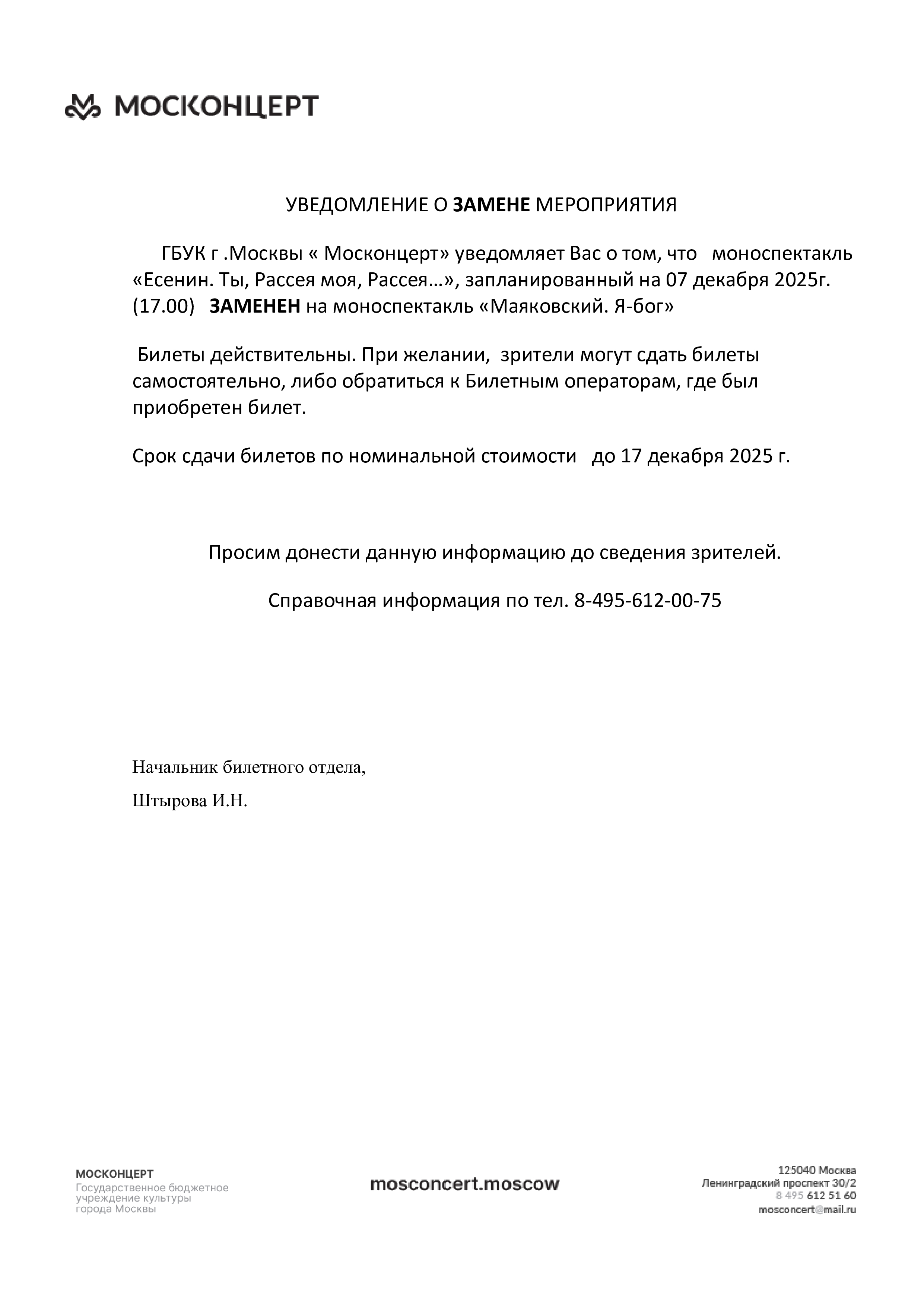 Уважаемый клиент! Спешим сообщить, что по информации, полученной от организатора, моноспектакль «Есенин. Ты, Рассея моя, Рассея...», запланированный на 7 декабря 2025 года года в 17:00 в Музыкальной квартире на Тверской, заменён на моноспектакль «Маяковский. Я-бог». Ранее приобретенные билеты действительны на новый спектакль, обменивать их не нужно. Если вы не хотите посетить новый спектакль, вы можете вернуть билет по кнопке в личном кабинете во вкладке «Заказы». Деньги за электронные билеты вернутся автоматически в полном объёме на карту, с которой была произведена оплата. Если вы купили билет в кассе Ticketland.ru за наличный расчет, то обратитесь, пожалуйста, на почту: vozvrat@ticketland.ru. С уважением, команда поддержки Ticketland.
